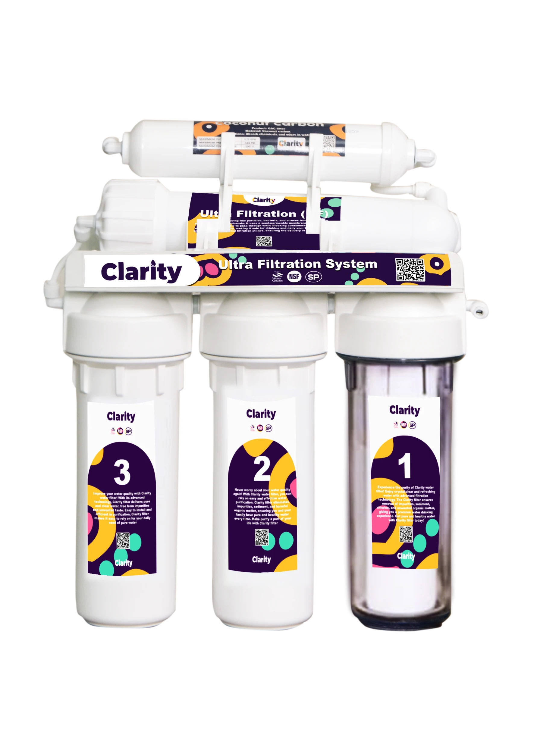 يعد فلتر "كلاريتي" 5 مراحل Ultra Filtration من أفضل الخيارات لتوفير مياه نظيفة وآمنة للشرب. يعتمد هذا الفلتر على تقنية الترا فلترشن (Ultra Filtration)، التي تمتاز بدقتها في إزالة الجزيئات الدقيقة والملوثات. إليك مكونات الفلتر ومزاياه التي تجعله خيارًا مثاليًا لتنقية المياه المنزلية.
